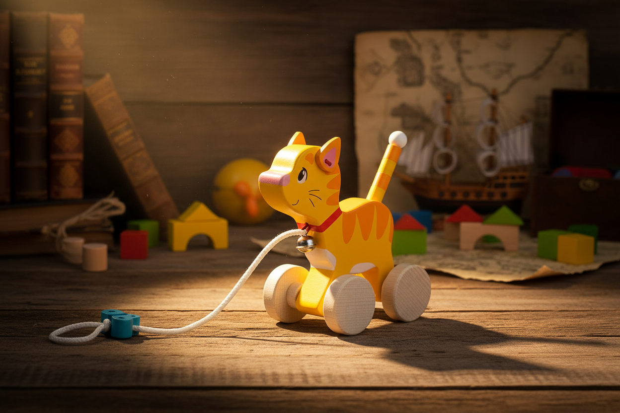 Der blaue Schmetterling flattert vor der Katze, die ihn lächelnd beobachtet. Hier ist ein entzückendes Nachziehtier aus Holz, das alle Kinder begeistern wird. Dieser treue Ausflugsbegleiter sorgt im Vorbeigehen für bewundernde Blicke.