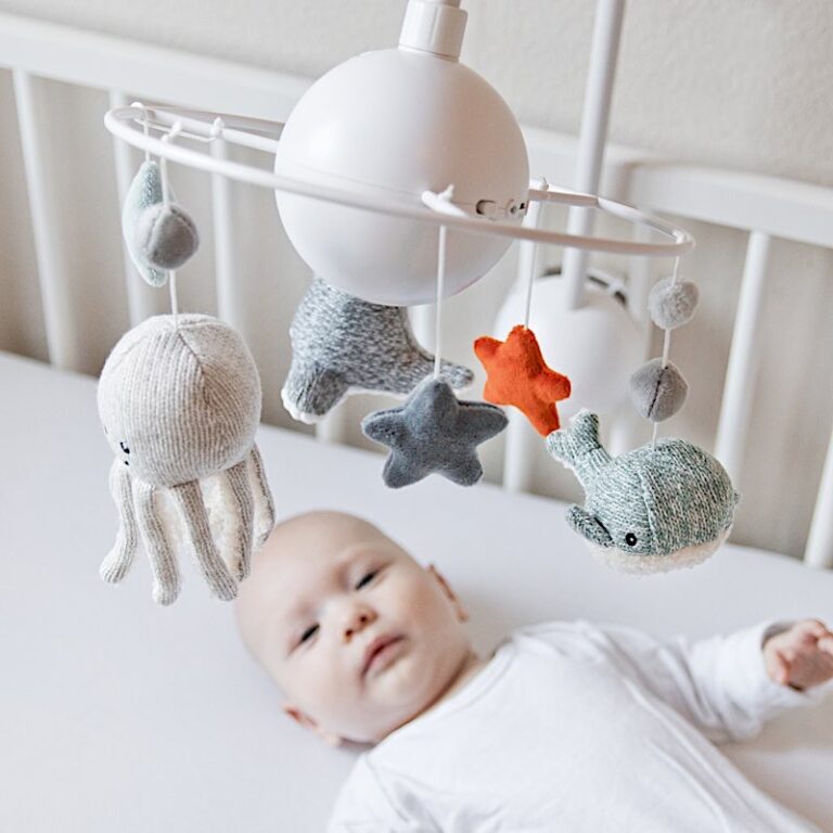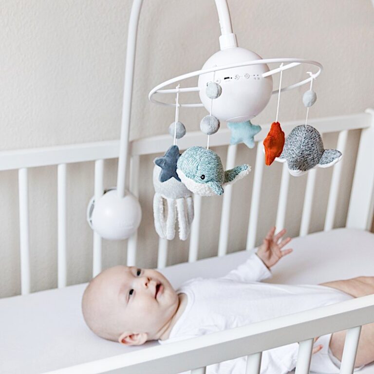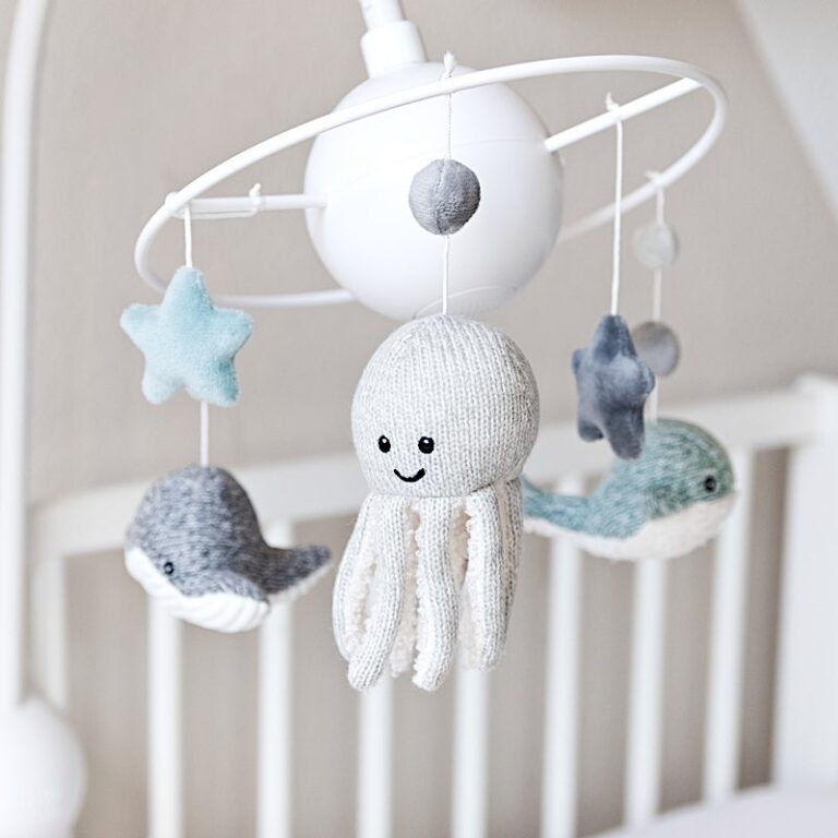 A baby mobile with OCEAN patterns (Olly and Moby), with 4 different melodies. Remote control included. Ideal in a baby park or bars bed.