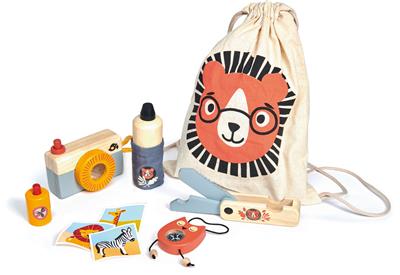Tender Leaf Plein Air: AVENTURE SAFARI 48x33x12,5cm, avec sac, boussole, canif, spray anti-moustique, bouteille d'eau et appareil photo, en bois, en boîte 26,7x9,7x21,2cm, 3+