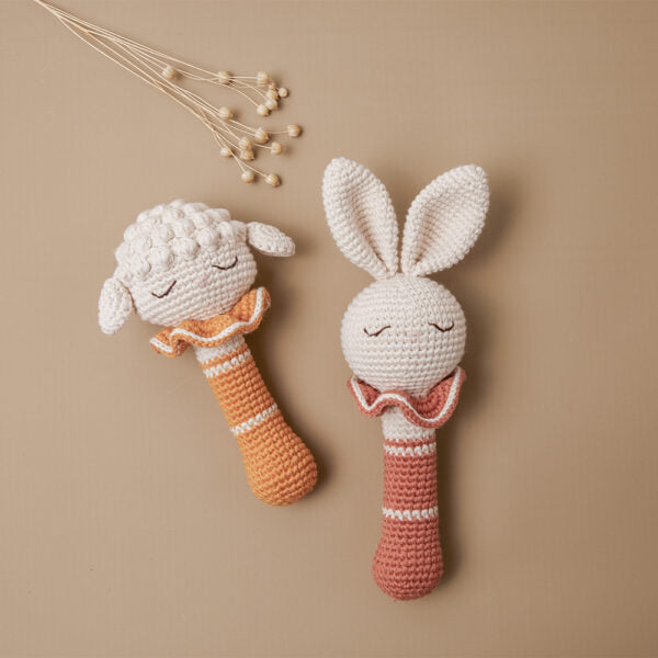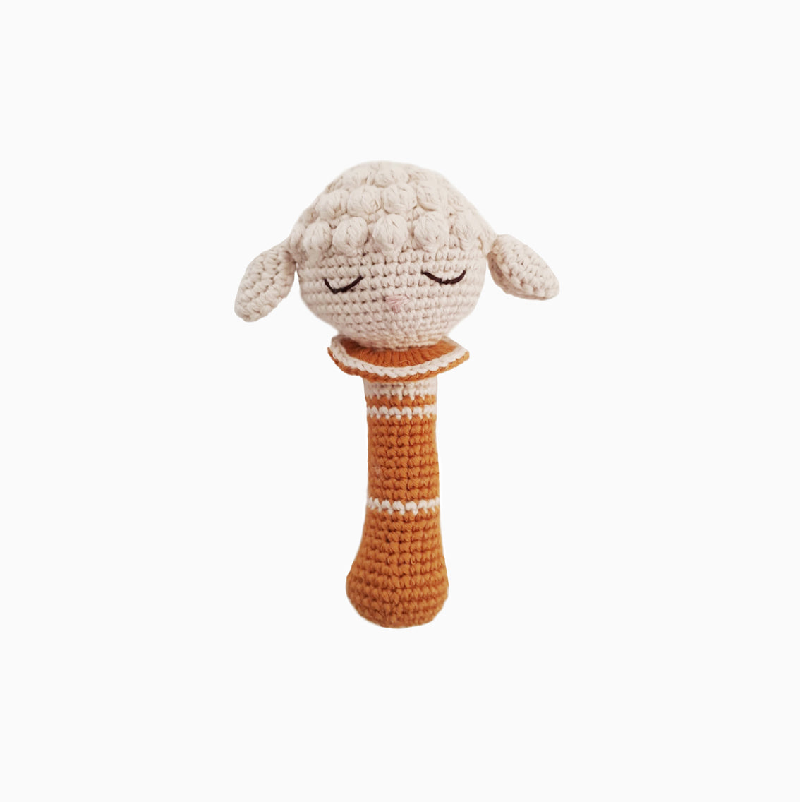 Ce hochet classique avec sa petite tête d’agneau est facile à tenir et il fait du bruit grâce à son grelot quand on le secoue.
