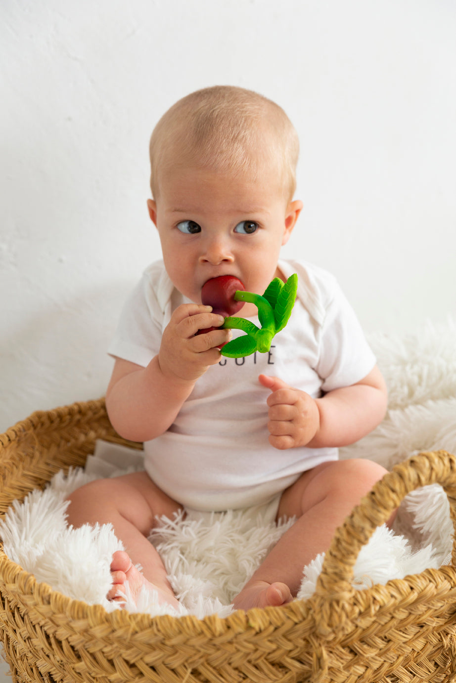 Mery la cerise : l’un des fruits les plus doux transformé en jouet de dentition ! L’espace entre les deux queues facilite la prise en main et les feuilles soulageront les petites gencives qui ont besoin de machouiller.