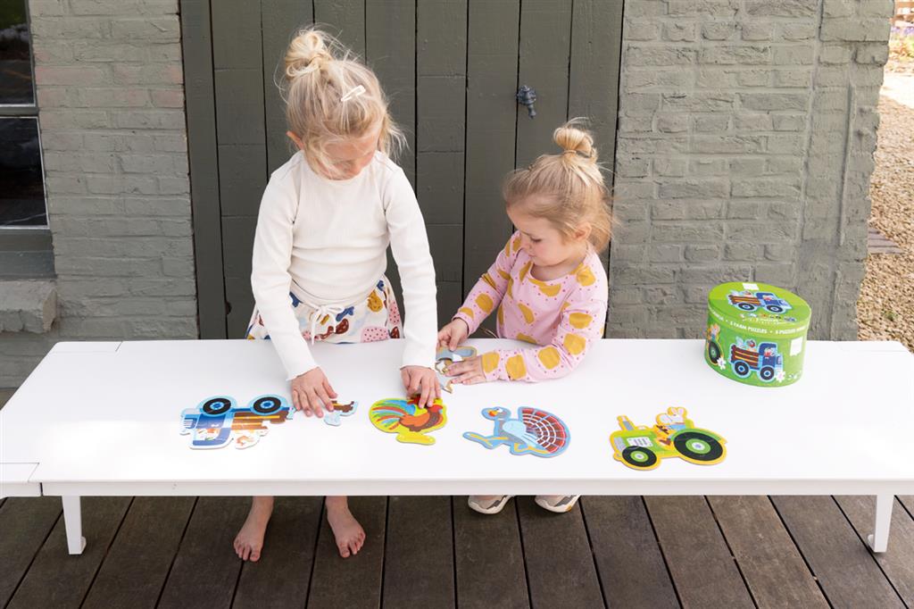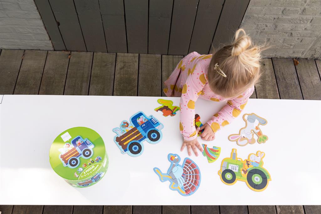 Amusement garanti grâce à ces puzzles évolutifs sur le thème de la ferme. 5 puzzles joliment illustrés pour les plus petits. Cinq figurines amusantes à assembler : lapin (3 pièces), paon (4 pièces), coq (5 pièces), tracteur (6 pièces) et camion (8 pièces).