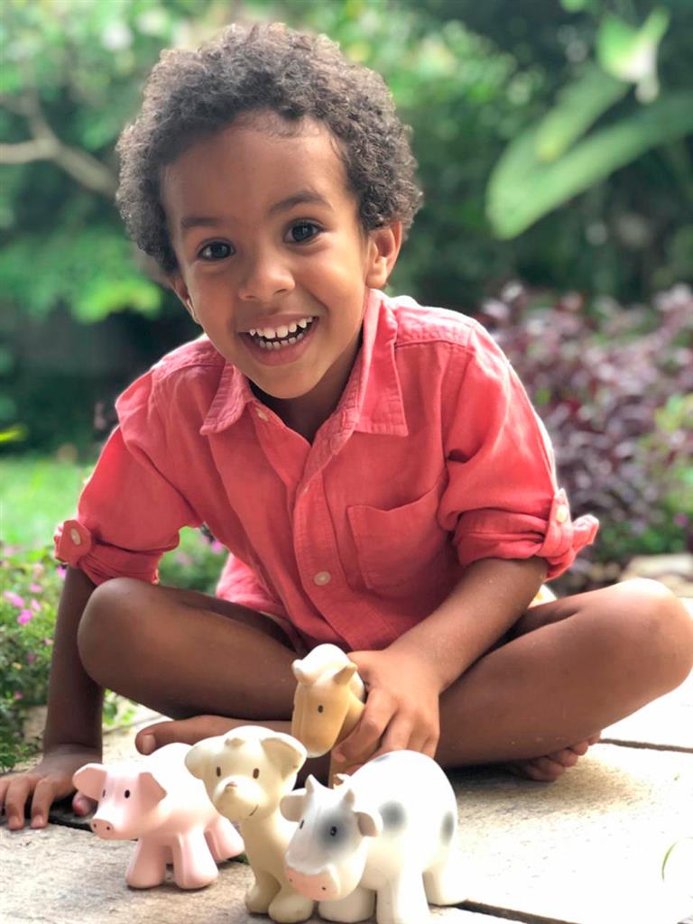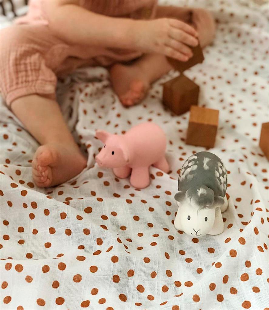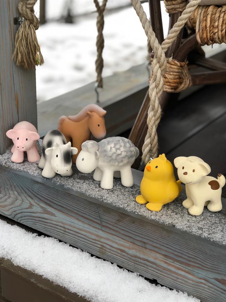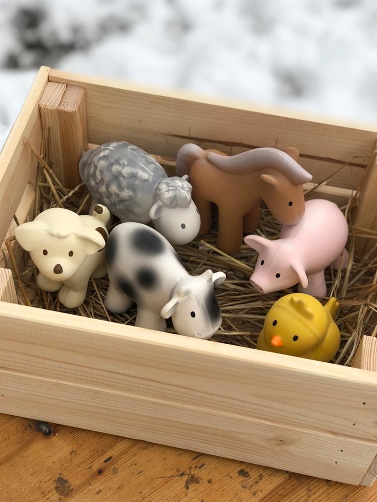 Jouets de bain en caoutchouc naturel et anneaux de dentition.